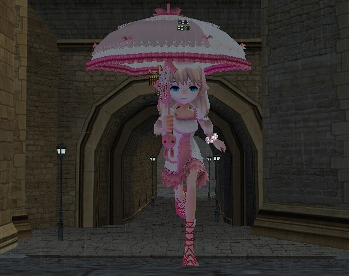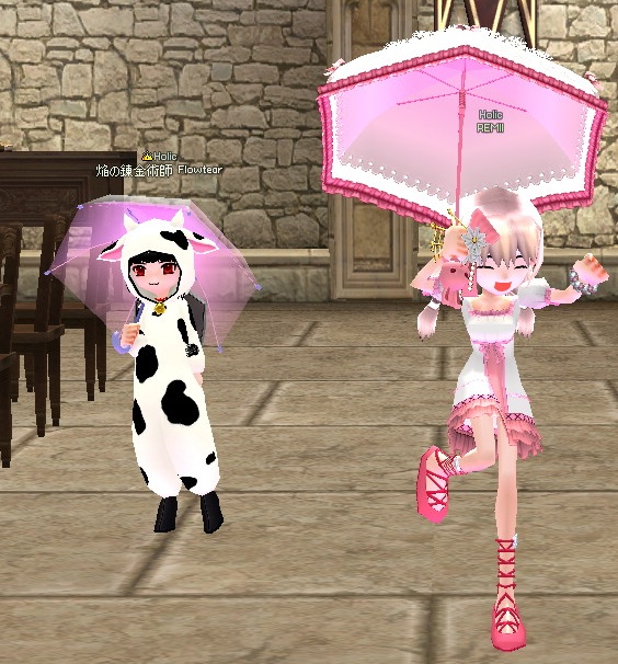 そして傘を買ったので、牛さんとギルドホールでピョンピョン跳ね回ってます